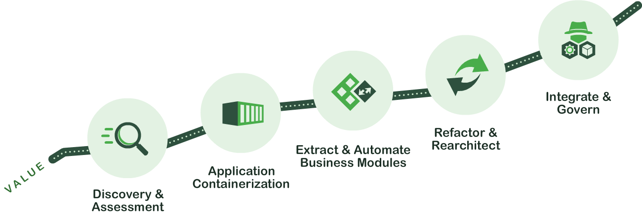 Using the insights from discovery in step 1, architects can decide the how to slice the application into components: each of which can be packaged into a self-contained and portable software unit, called containers. Once this is complete. the same application components will be able to run as containers bringing in some of the operation benefits that are native to containers. It is possible to insert some additional service monitoring capabilities at this stage to improve operations visibility. DevOps automation can also be introduced at this stage.